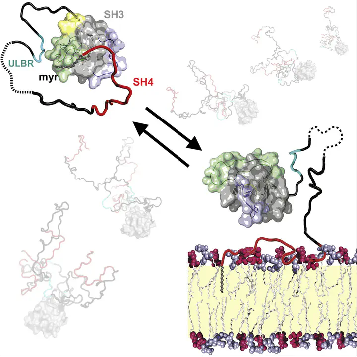 Image by Le Roux et al. CC BY 4.0The c-Src oncogene is anchored to the cytoplasmic membrane through its N-terminal myristoylated SH4 domain. This domain is part of an intramolecular fuzzy complex with the SH3 and Unique domains. Here we show that the N-terminal myristoyl group binds to the SH3 domain in the proximity of the RT loop, when Src is not anchored to a lipid membrane. Residues in the so-called Unique Lipid Binding Region modulate this interaction. In the presence of lipids, the myristoyl group is released from the SH3 domain and inserts into the lipid membrane. The fuzzy complex with the SH4 and Unique domains is retained in the membrane-bound form, placing the SH3 domain close to the membrane surface and restricting its orientation. The apparent affinity of myristoylated proteins containing the SH4, Unique, and SH3 domains is modulated by these intramolecular interactions, suggesting a mechanism linking c-Src activation and membrane anchoring.